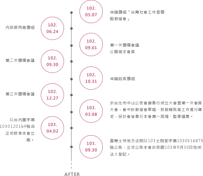 懷抱著這樣的理念,從一個人的苦思開始,到一群人的行動,最後,認同這理念的我們聚集在一起,由戴世玫擔任籌備會主任委員,共計30名發起人共同發起,於是,「社團法人台灣社會工作督導服務協會」(Taiwan Social Work Supervision Asssociation,簡稱TW Supervisors) 帶著美好的憧憬誕生了!很榮幸的,本會成為台灣第一個,也是目前唯一的全國性社會工作督導團體,期望未來能在社會工作政策制度和專業實務工作上發揮更好的影響力!