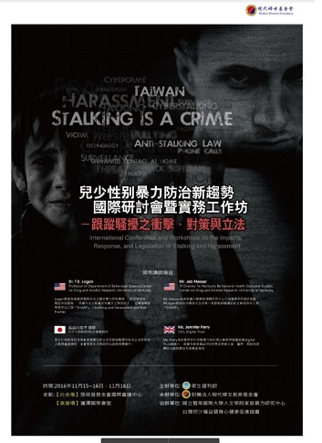 現代婦女基金會將於11/15-16與18舉辦2016「兒少性別暴力防治新趨勢國際研討會暨實務工作坊」,邀請日本、美國與英國之重量級專家來台探討跟蹤與騷擾的防治與政策。
