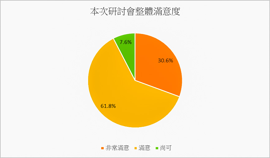 92%以上(填答滿意、非常滿意)參與的社工夥伴對於本次研討會的整體滿意度感到滿意。