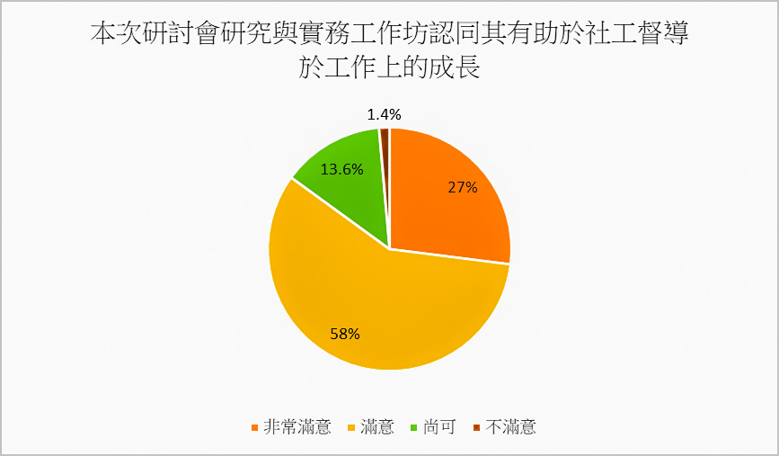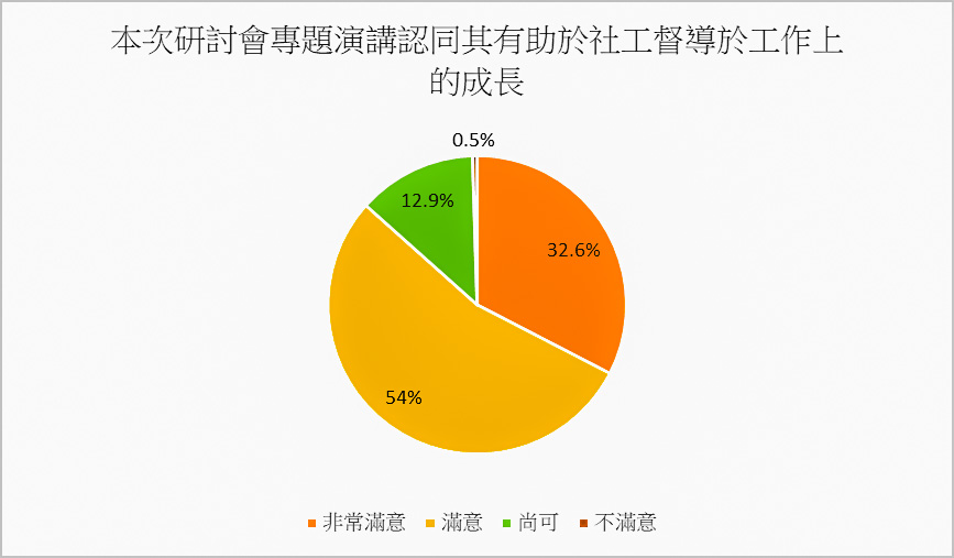 86%以上(填答滿意、非常滿意)參與的社工夥伴對於本次研討會專題演講認同其有助於社工督導於工作上的成長。