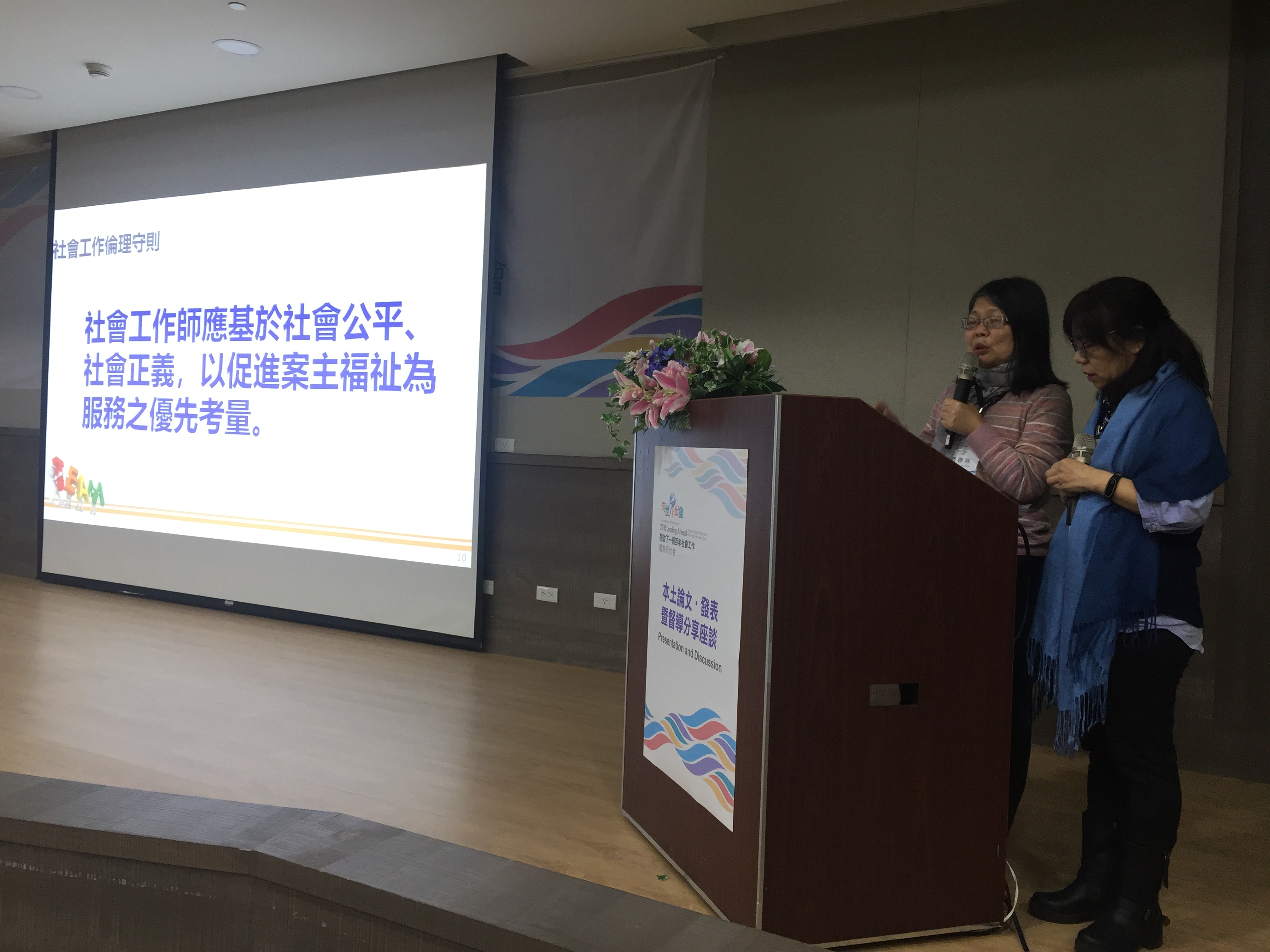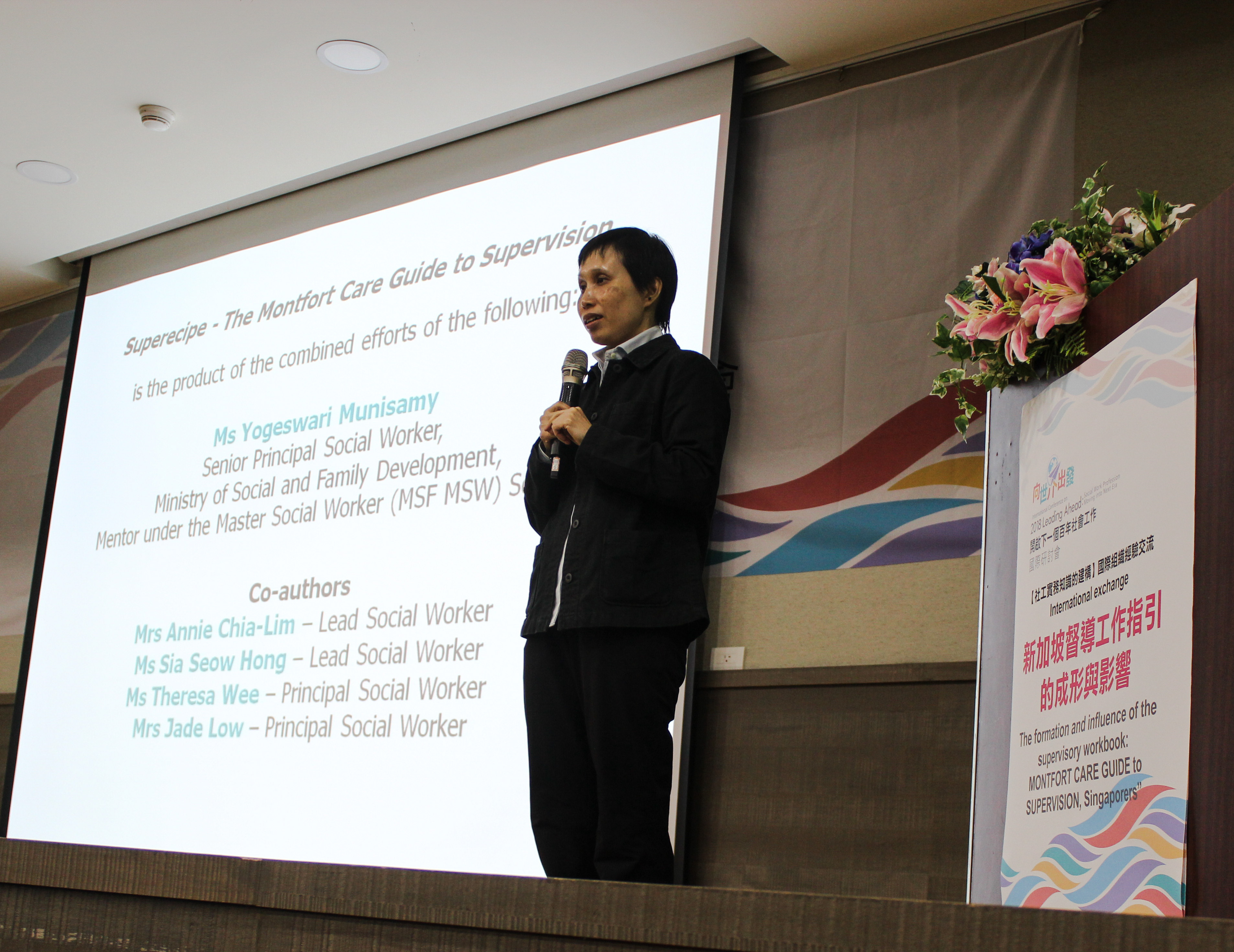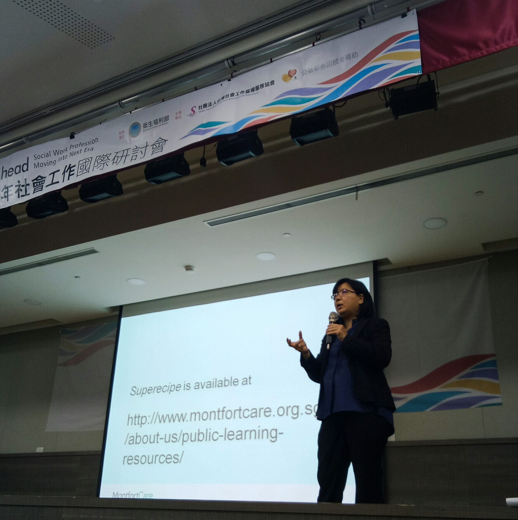 由新加坡Montfort Care首席社工 Ms. See Yim Low(劉詩韻)、新加坡Montfort Care資深社工 Ms. Faith Png(方月云)進行演講,主題:新加坡督導工作指引的成形與影響The formation and influence of the supervisory workbook: MONTFORT CARE GUIDE to SUPERVISION, Singapore,並由李開敏自由執業資深社工督導進行現場即席翻譯。