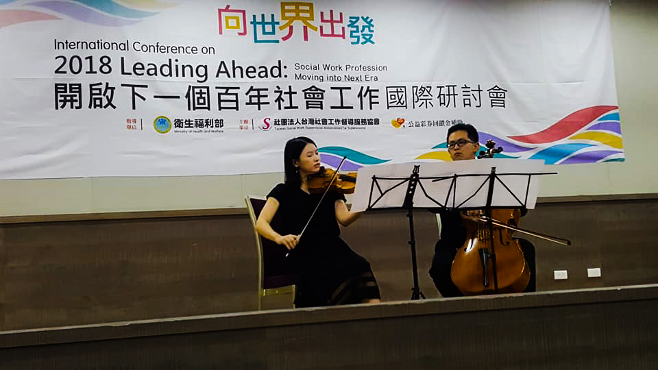 由現任藝享愛樂管弦樂團大提琴蔡寧老師、小提琴徐筱玲老師為與會的社工夥伴們獻上Satie:Je Te Veux、Gardel:Melodia de arrabal、Grieg:In the Hall of the Mountain king、望春風、蘭陽舞曲這五首歌曲的音樂表演,透過悠揚的琴聲,謹獻給與會的嘉賓以及社工夥伴們,為社會工作督導專業邁向下一個百年喝采!