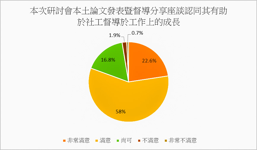 80%以上(填答滿意、非常滿意)參與的社工夥伴對於本次研討會本土論文發表暨督導分享座談認同其有助於社工督導於工作上的成長。