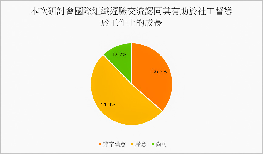 87%以上(填答滿意、非常滿意)參與的社工夥伴對於本次研討會國際組織經驗交流認同其有助於社工督導於工作上的成長。