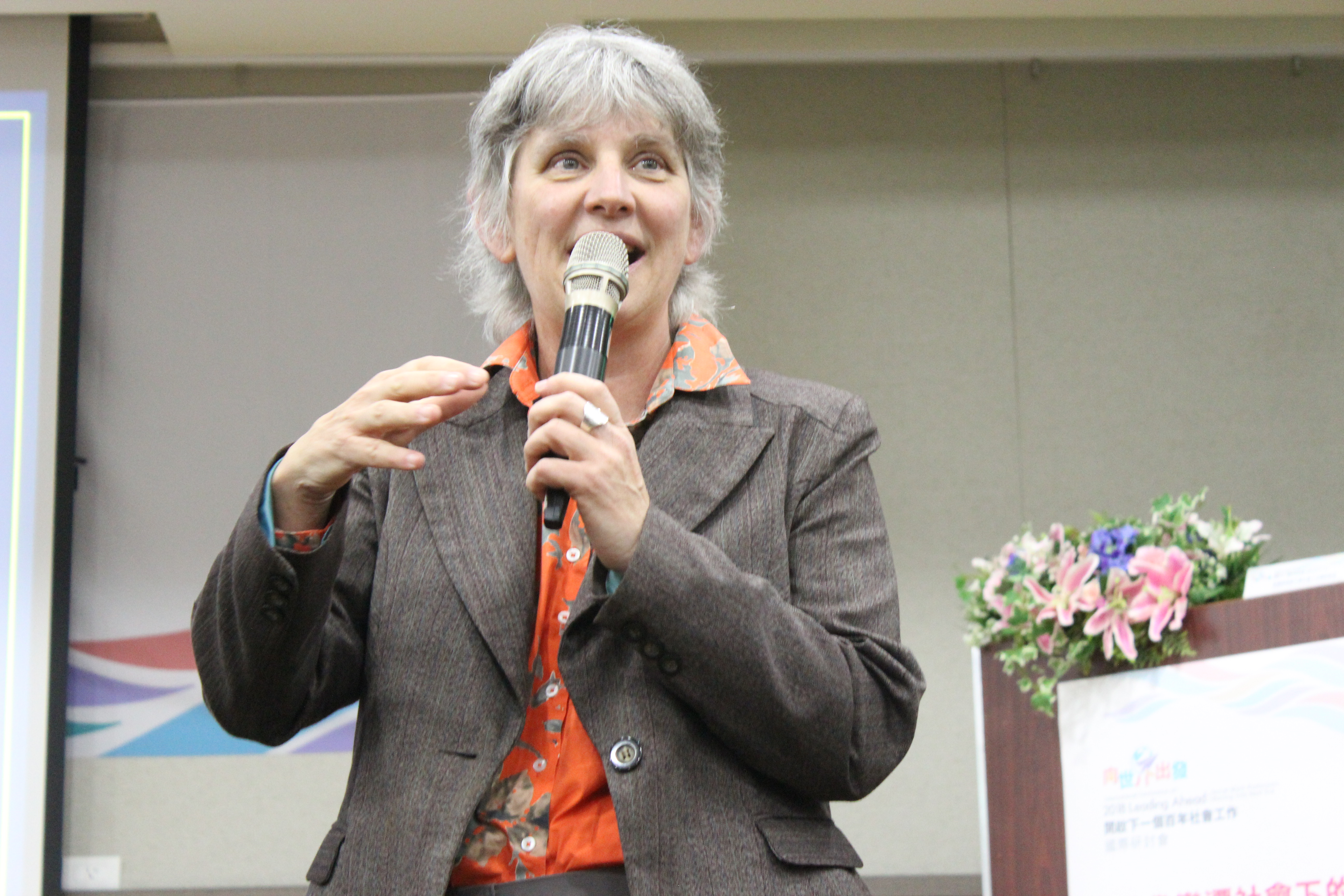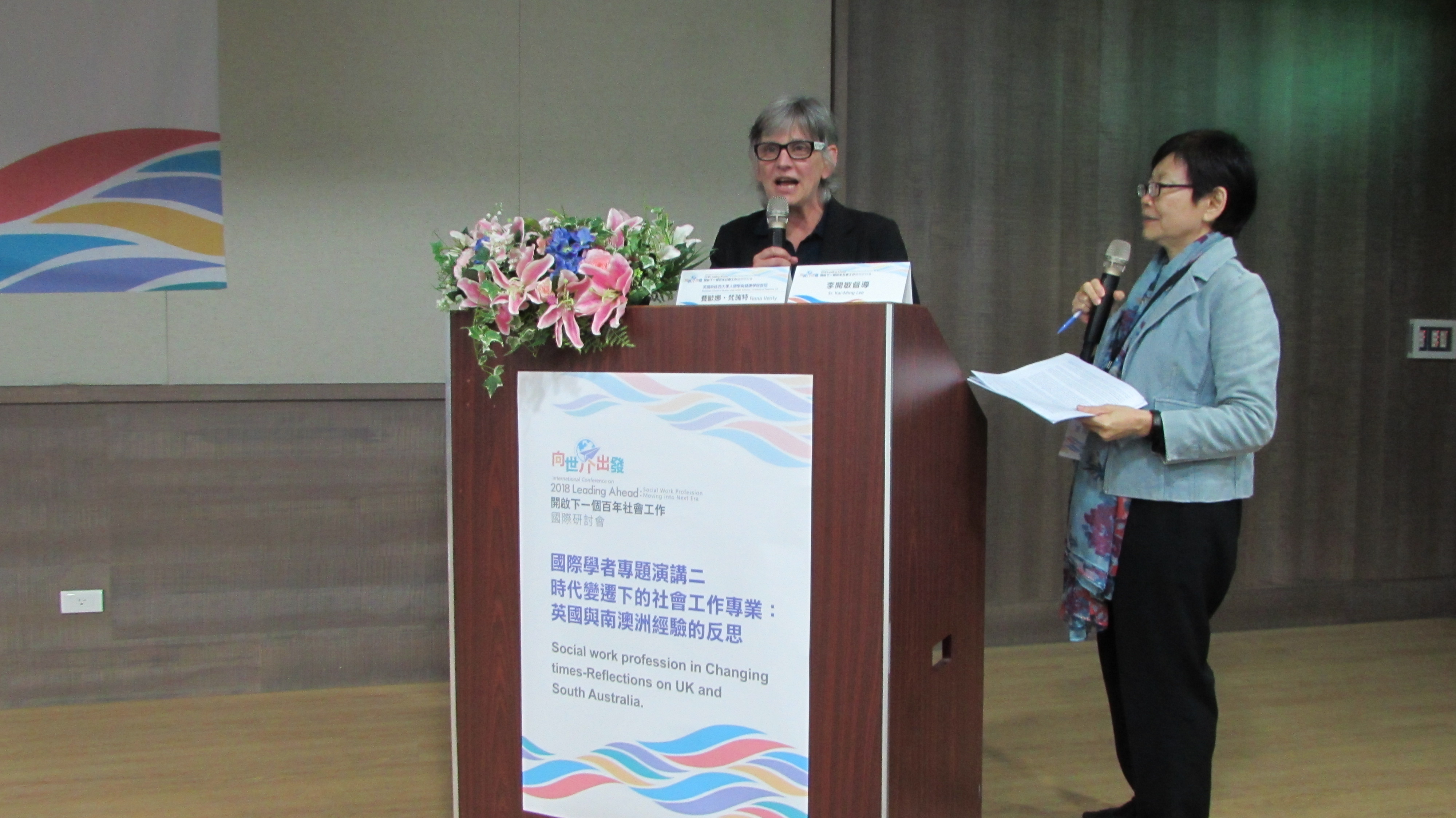 由英國斯旺西大學人文和健康科學院 Dr. Fiona Verity教授進行專題演講,主題:Social work profession in Changing times-Reflections on UK and South Australia,並由李開敏自由執業資深社工督導進行現場即席翻譯。Dr. Fiona Verity的專題演講從自然環境影響的觀點討論時代變遷,接著帶入主題,講述早年在澳洲社區的工作經驗,並說明社會學觀點下先行者所給予的啟示:時間正在有意識地前進,經典卻仍舊具有永恆的意義。最後以現代科技與自然環境的時代變遷,來呼應社區是為未來社會工作專業發展中的另一個重要支柱,預防比處遇更加重要。
