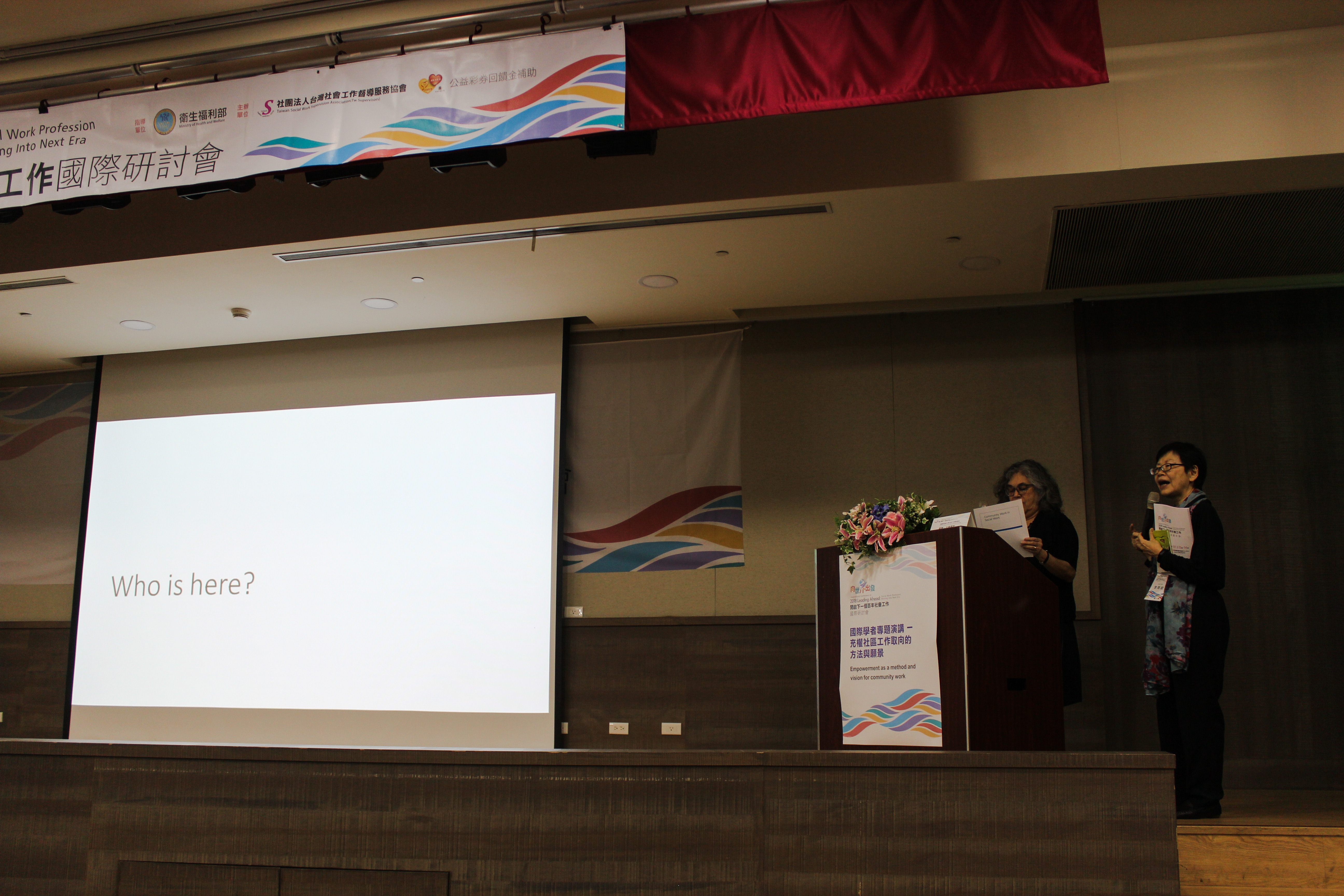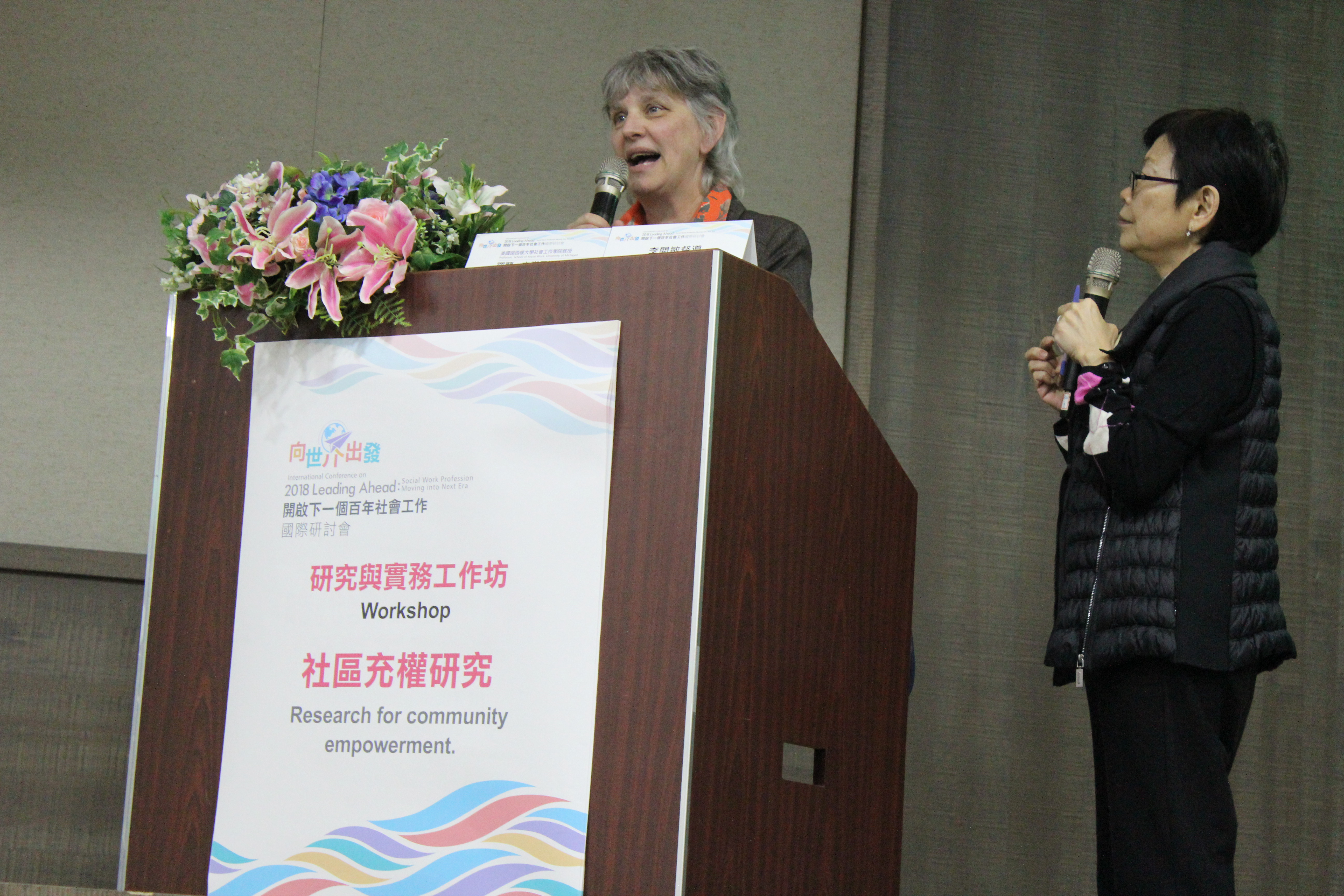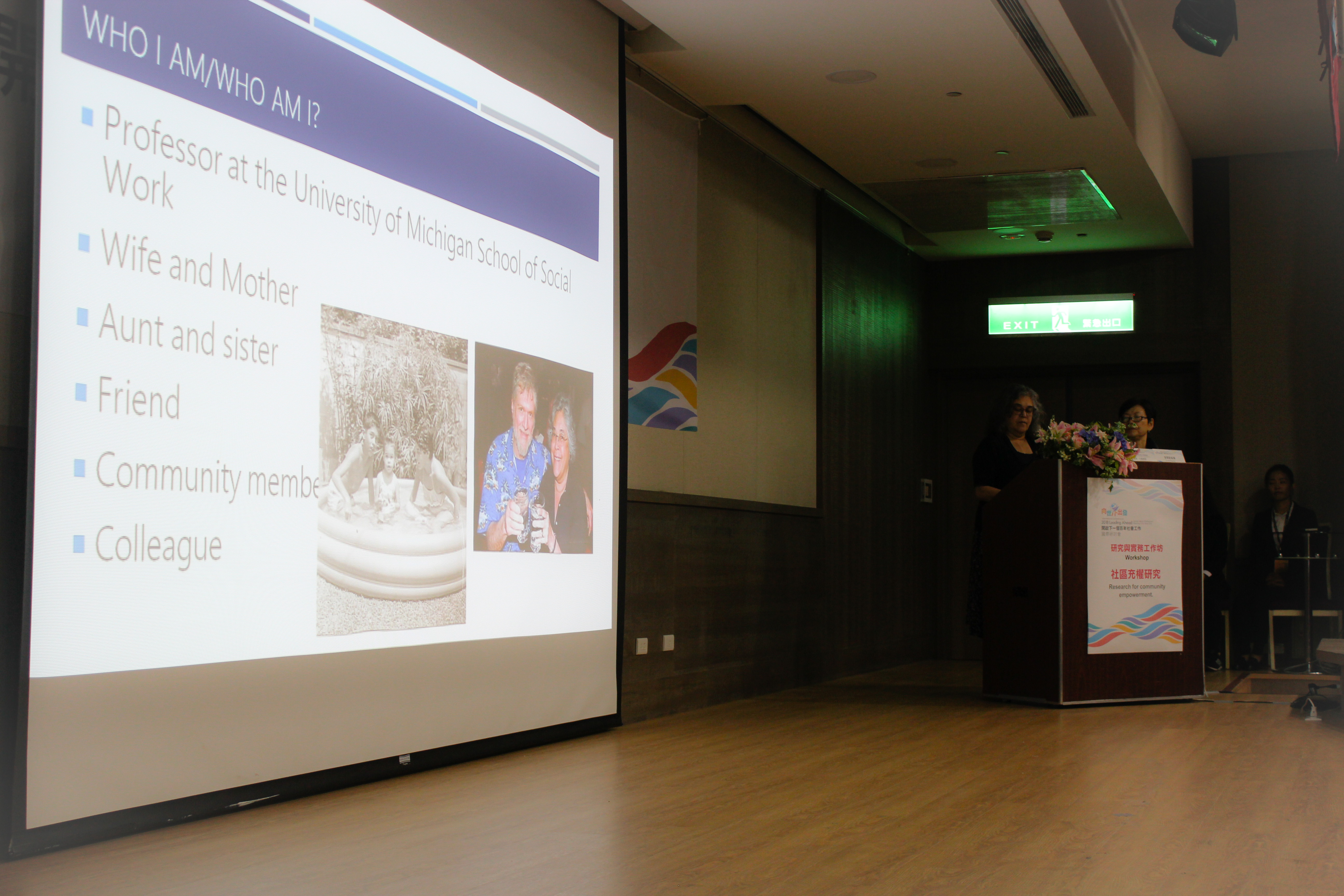 由美國密西根大學社會工作學院 Dr. Lorraine M. Gutiérrez教授進行演講,演講主題:Research for community empowerment,並由李開敏自由執業資深社工督導進行現場即席翻譯。Dr. Lorraine M. Gutiérrez先介紹三本社區工作實務相關的重要說明,並介紹社區實務工作中不同層次的衝突。接著引述20世紀晚期的內外在影響,並開始討論社區工作者的形象與重要根基,以此介紹當代社區實務的策略與戰術,逐步討論社區實務與充權社區的作為。唯有實踐者深信人們會改變,並且環境會因之轉變,充權觀點的工作才得以繼續。