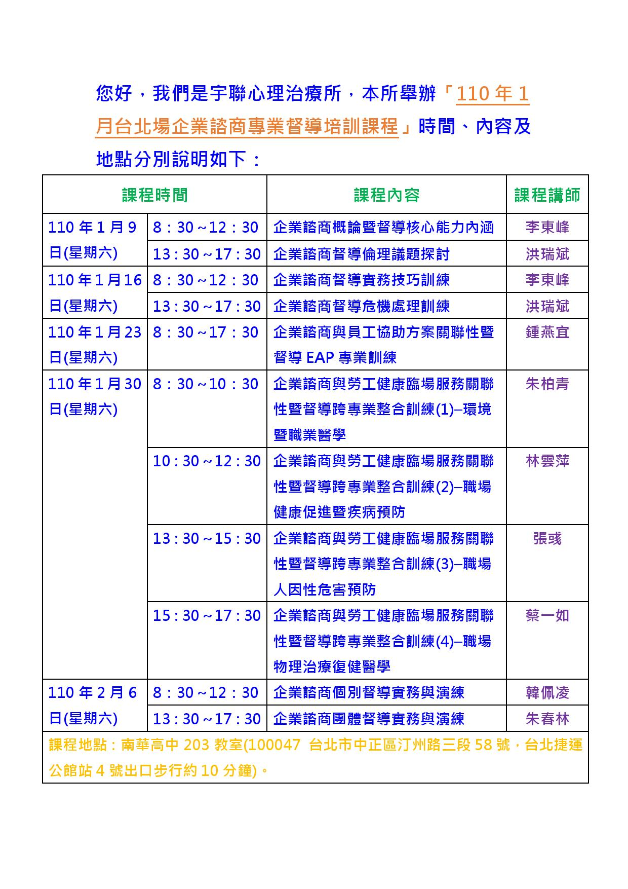 | 110年1月台北場企業諮商專業督導培訓課程 | 北部 | 2021.01.09 ~ 02.06 | 08:30~17:30 | 2021.01.01 ~ 02.09 |