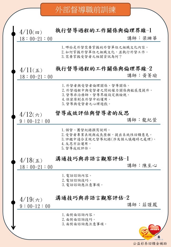 | 外部督導職前訓練 | 其他 | 2025.03.14 ~ 03.14 | 詳如附件 | 2025.03.14 ~ 03.31 |